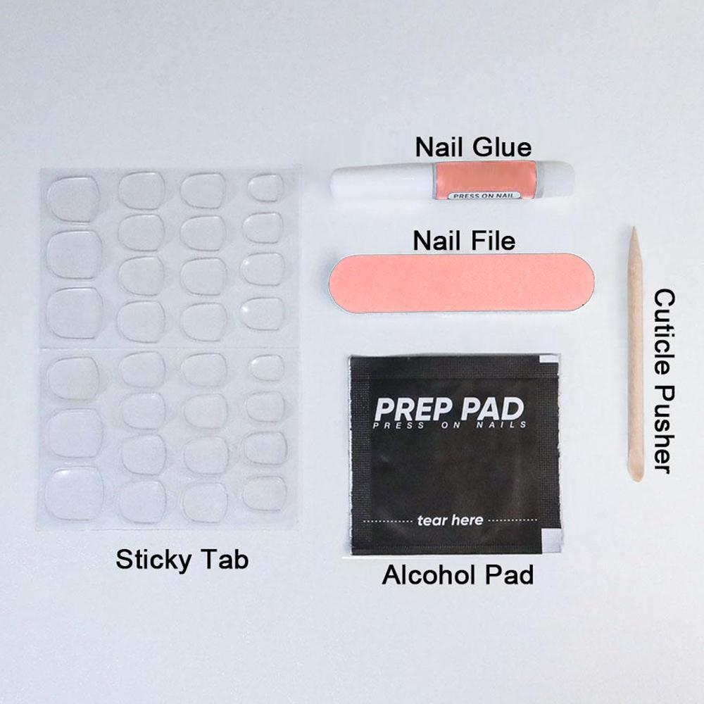 Kit Includes:( 24 nails in 12 inclusive sizes、30pcs sticky tabs、Nail glue(Net Wt.0.07oz/2g)、Nail file、Cuticle pusher、Alcohol pad)